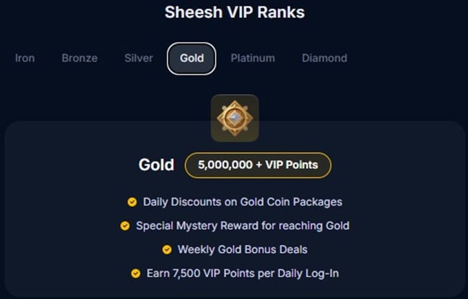 The VIP program at Sheesh operates on a points-based tier system with five levels: Iron, Bronze, Silver, Gold, and Platinum. You accumulate VIP Points through two primary methods, daily logins and Gold Coin purchases, with every dollar spent translating to 100 VIP Points. What sets this apart from competitors is the transparency, each tier displays exact benefits and requirements upfront rather than keeping players guessing about what they'll unlock.