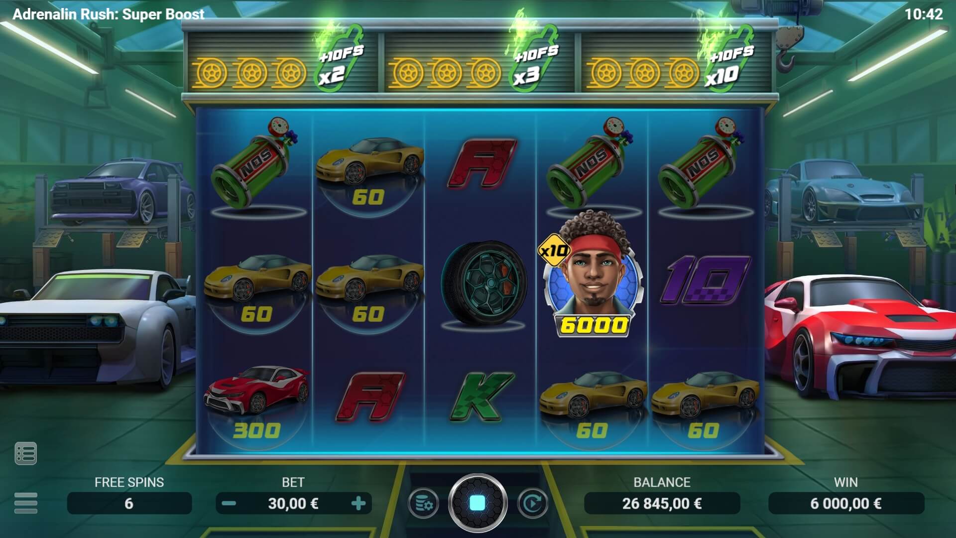 Adrenaline Rush: Super Boost from Evoplay centers on car racing themes with three selectable Wild symbols before triggering free spins.