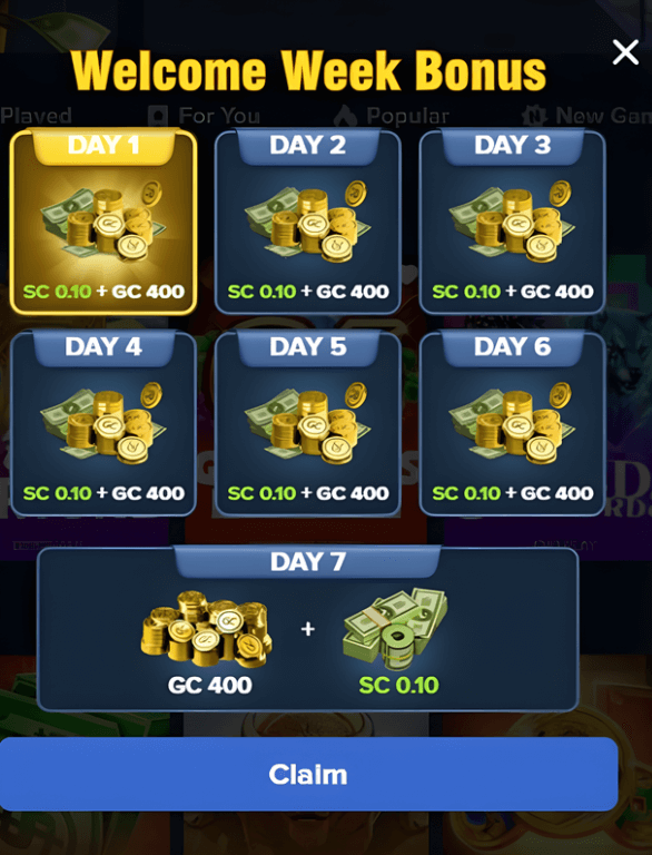 | Welcome Week | 400 GC + 0.10 SC per day for 7 days | Standard 1x SC for any redeemed prizes | Daily claim window; missed days lost | SC usable on most SC slots and instant wins |