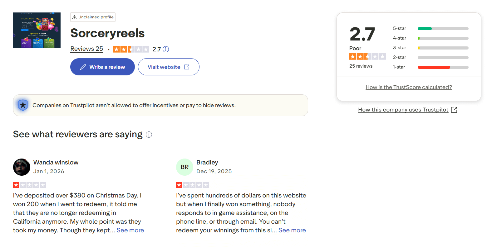 My assessment:Â Whenever you see a pattern of player reviews/feedback of this nature, that is a big red flag. I would not recommend you play at Sorcery Reels. Instead, I would suggest you check out our curated list of Sweepstakes with best payouts to find a tusted pick.Â