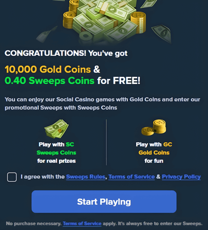 New players at Sorcery Reels receive 10,000 Gold Coins and 0.40 Sweeps Coins plus 5 free SC spins after completing registration and agreeing to the Sweeps Rules.