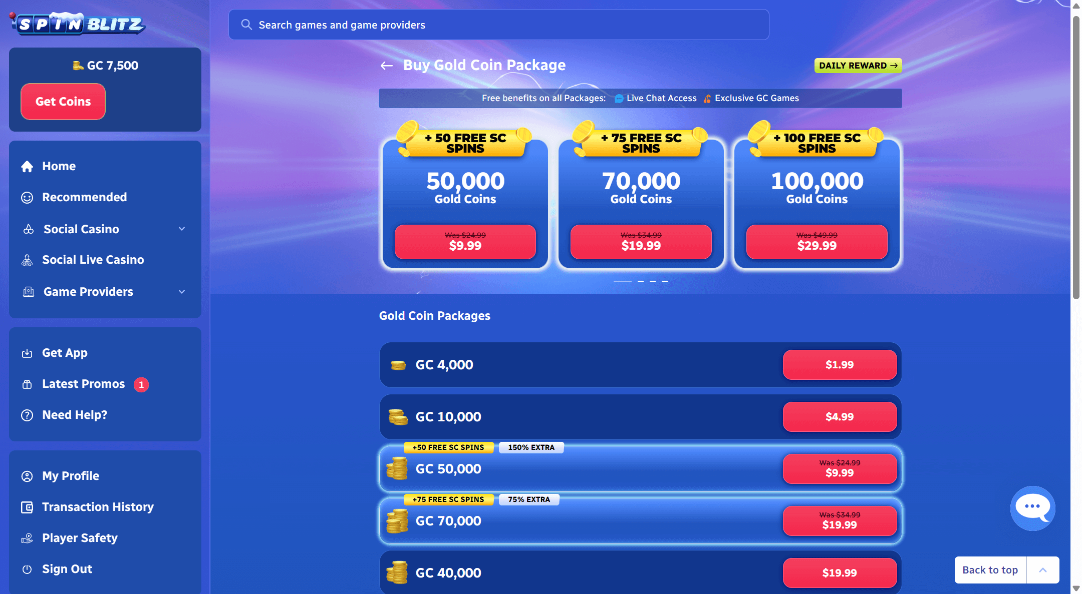 Their welcome offer is stacked and highly accessible: you get 7,500 Gold Coins, 2.5 Sweeps Coins, and 5 Sweeps spins as soon as you create an account, no purchase or bonus code needed. For those looking to get the most out of their first purchase, SpinBlitz also delivers one of the best value starter bundles in the United States right now.