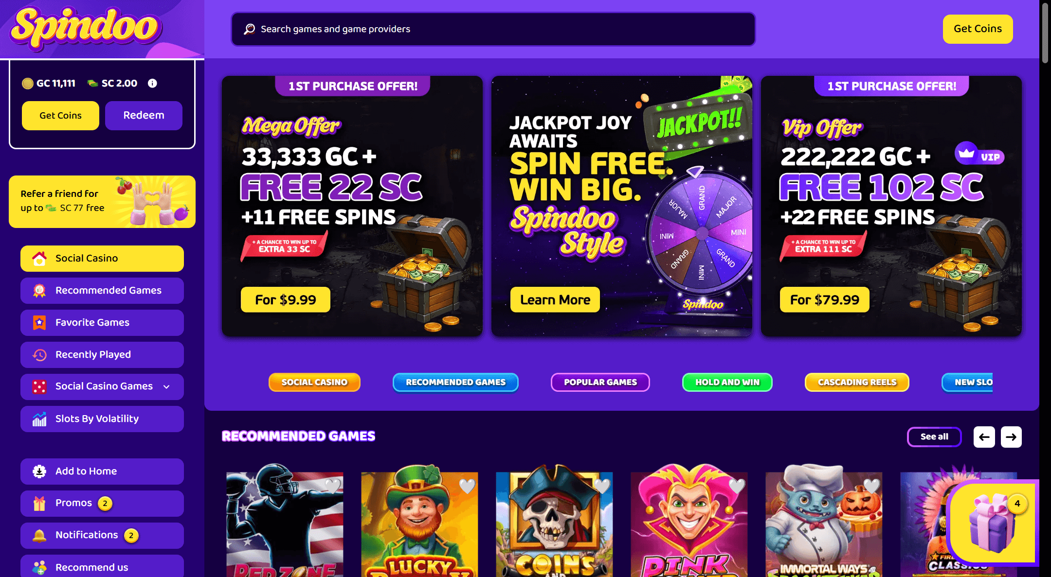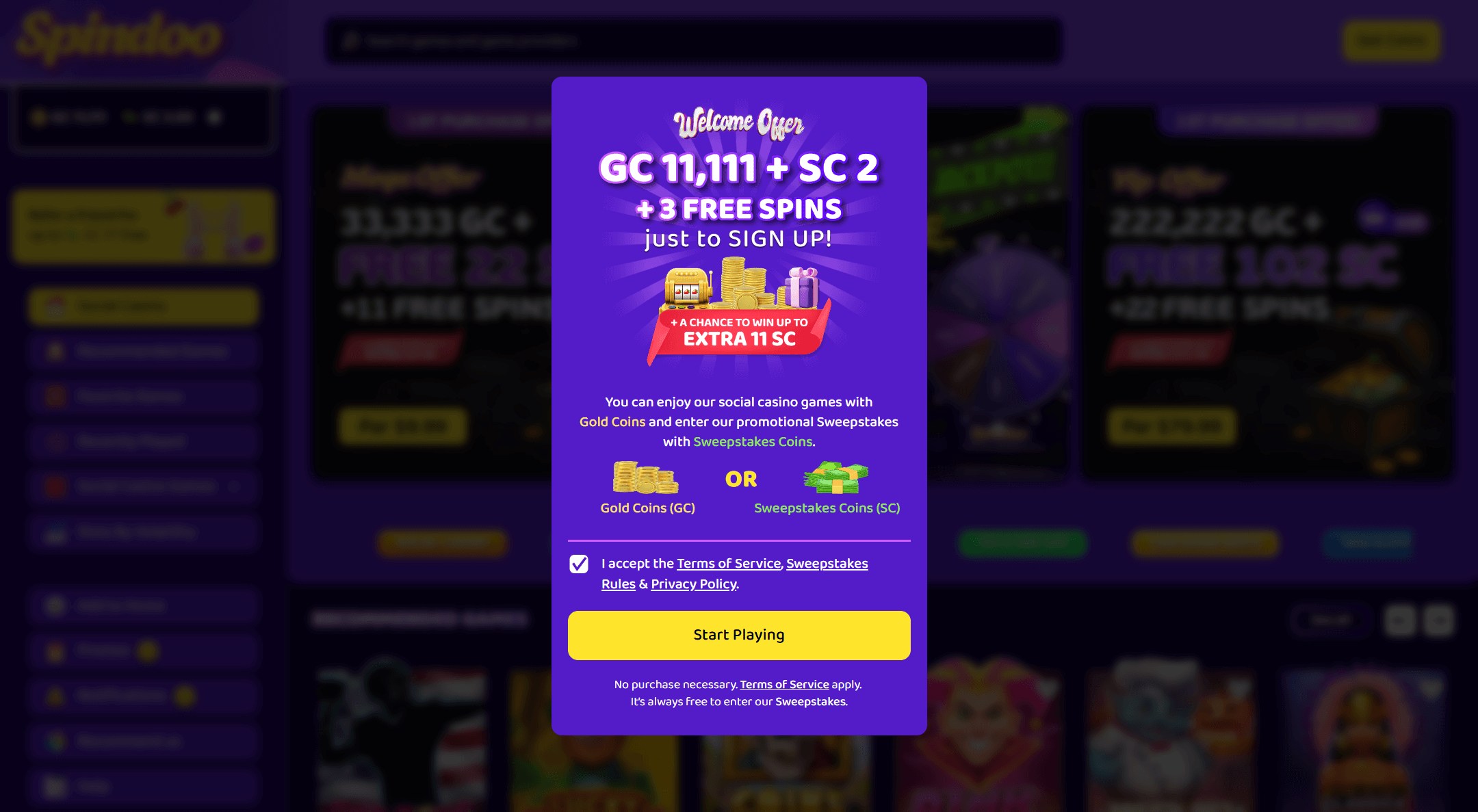 Signing up at Spindoo means youâre instantly greeted with 11,111 Gold Coins, zero purchase required. Thereâs no promo code chase, itâs just there, letting you dive straight into slots and table games. Ongoing rewards include daily wheel spins (up to 1,111 GC and 2 SC), periodic social media drops, and a first-purchase 200% Gold Coin match with bonus Sweeps Coins. Bonuses have simple requirements and the 1x SC playthrough on redemptions is a relief over the industryâs usual mess of rollover demands.