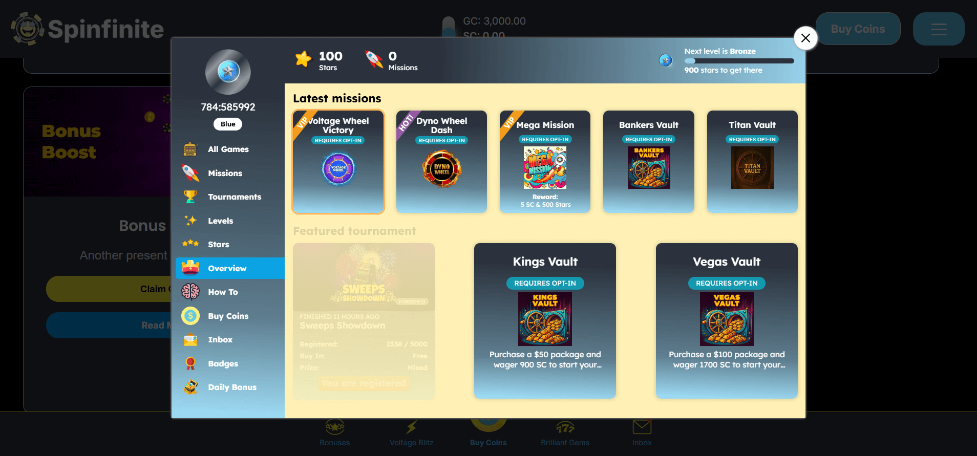 Spinfinite keeps players coming back with daily missions, recurring slot tournaments and a seven-level VIP âStarsâ program. Your Stars build as you play and hit missions, unlocking bigger daily bonuses, bonus chests and private tournament access. Even as a new player, I racked up rank pretty quickâand at the top tiers, perks include boosted SC prizes and exclusive promos.