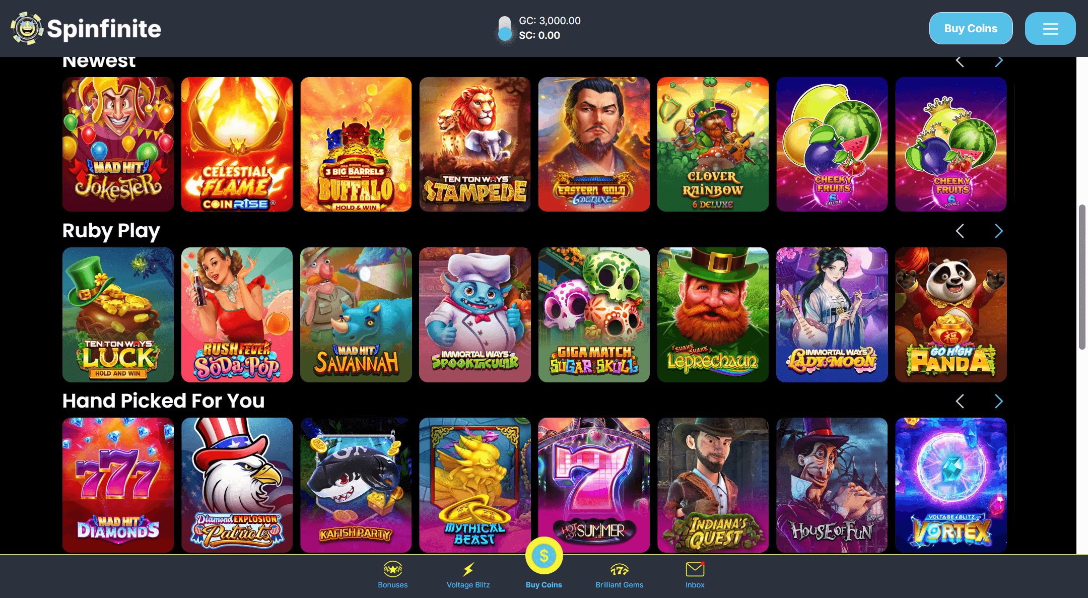 Right from my first Infinity Wheel spin, Spinfinite felt rewarding and unpredictable in all the right ways. The instant GC drop, mission variety, and steady bonus incentives had me returning daily. Though lacking in table game options, everything on the slots and scratch side was polished and engaging. Prize redemptions took about a weekâon par for sweepstakes sites. This is an âalways something to doâ casino, perfect for slot and bonus chasers who want a legit but easygoing sweepstakes club.