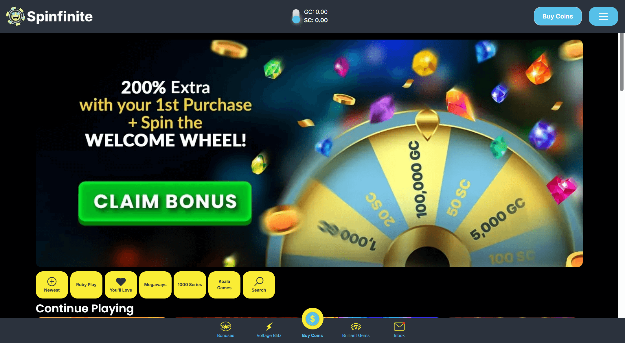 Jump into Spinfinite and snag 3,000 Gold Coins (GC) instantly on signupâno deposit or code needed, plus youâll get your pick of a daily mystery Infinity Wheel chest (I landed 2 SC on my first spin). The big upfront bonus comes with a 200% first-purchase match, offering 60,000 GC + 40 SC + a spin on the Infinity Wheel for just $20, (very good value). Daily missions, tournaments, and even a legit mail-in for free SC keep things rolling. Wager requirements are player-friendly (1x on SC).