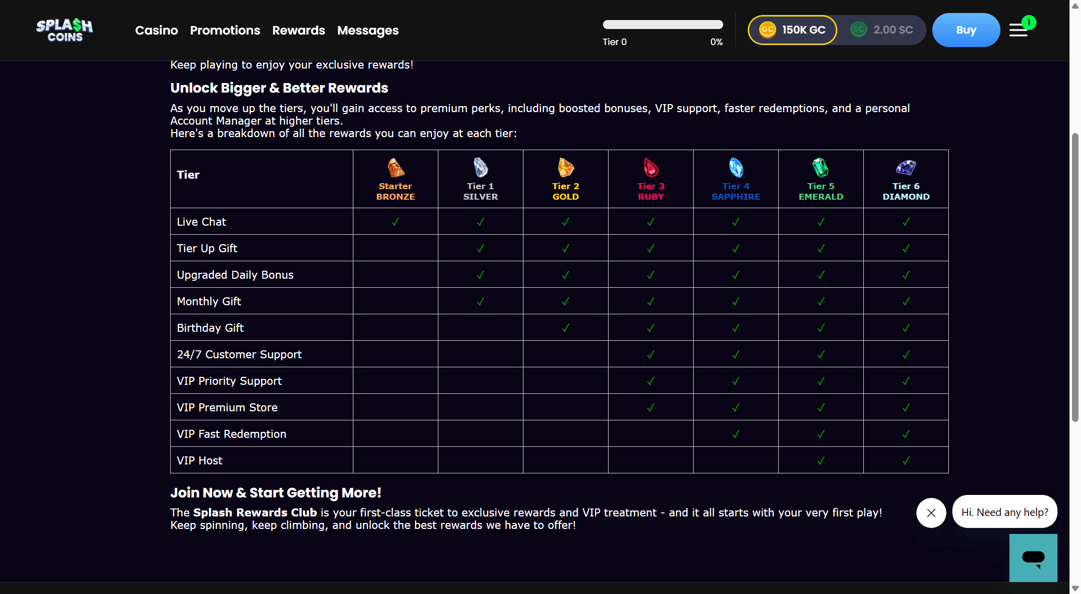 Splash Coins has a simple but rewarding 7-tier VIP program. You're starting point to the VIP program as a new player is the Bronze tier. The more you play the faster you climb up the tier ladder and the better the rewards.