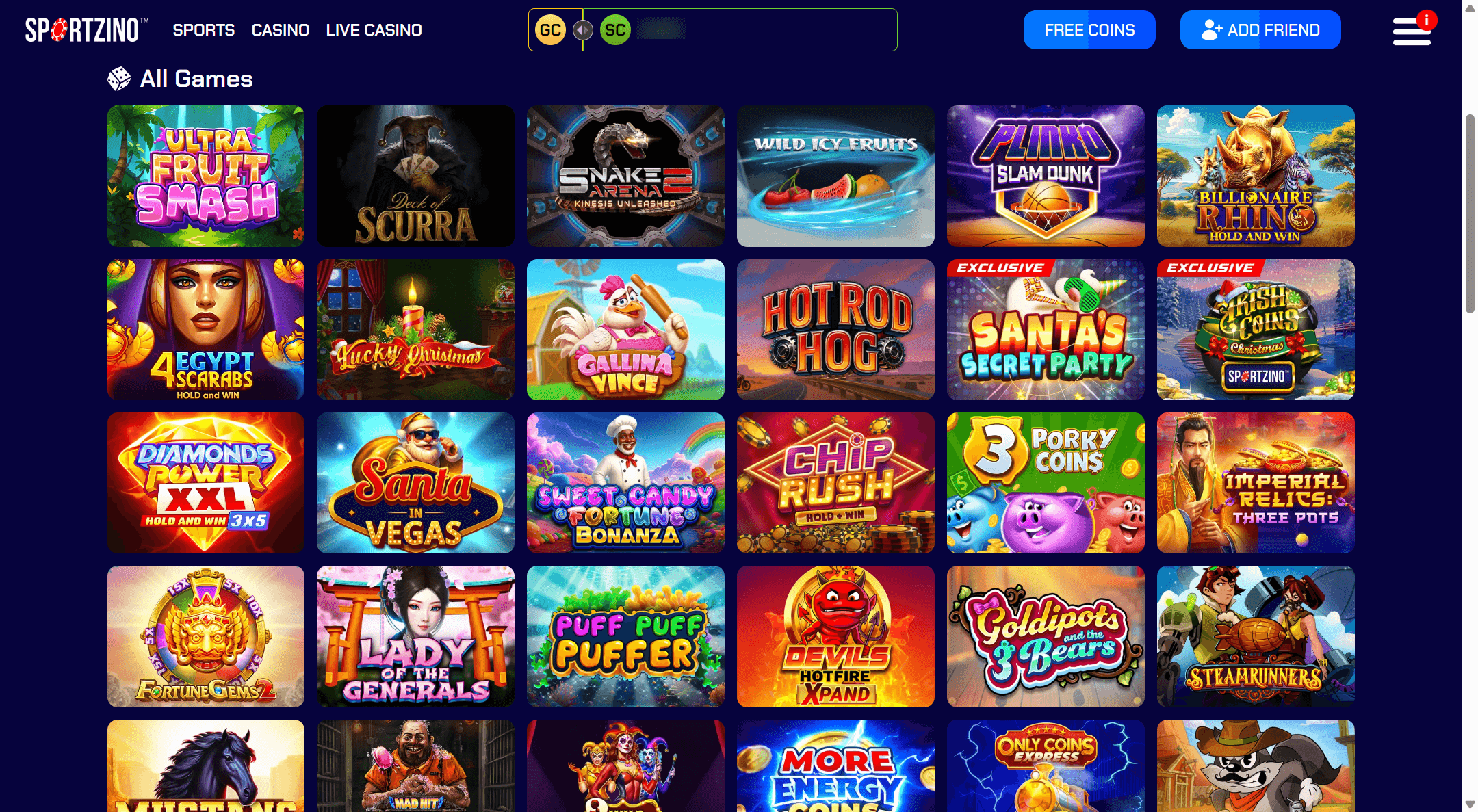 In terms of currencies, Sportzino sticks with the now standard double wallet model. Gold Coins handle the fun side of the equation and give me almost unlimited room to explore, while Sweeps Coins work as sweepstakes entries and can generate real world prize value once I meet the platform’s playthrough and verification rules.