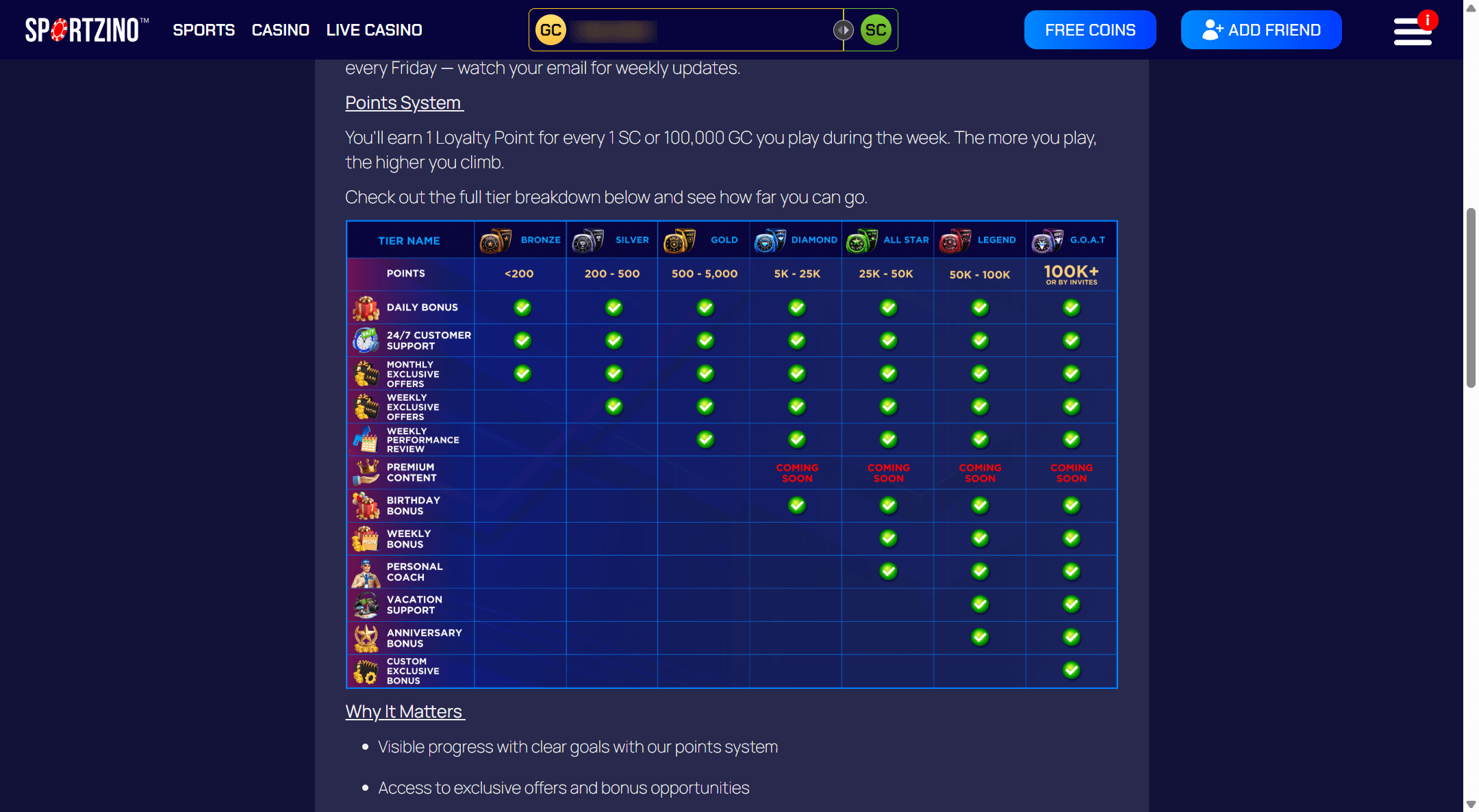 Sportzino does not run a traditional, ultra detailed VIP ladder in the same way some sweepstakes casinos do, but it does have a league style progression system that ticked a lot of the same boxes for me. The more I played, the more I felt gently pushed up through internal leagues, with better missions, occasional exclusive contests, and more interesting rewards showing up as I climbed.