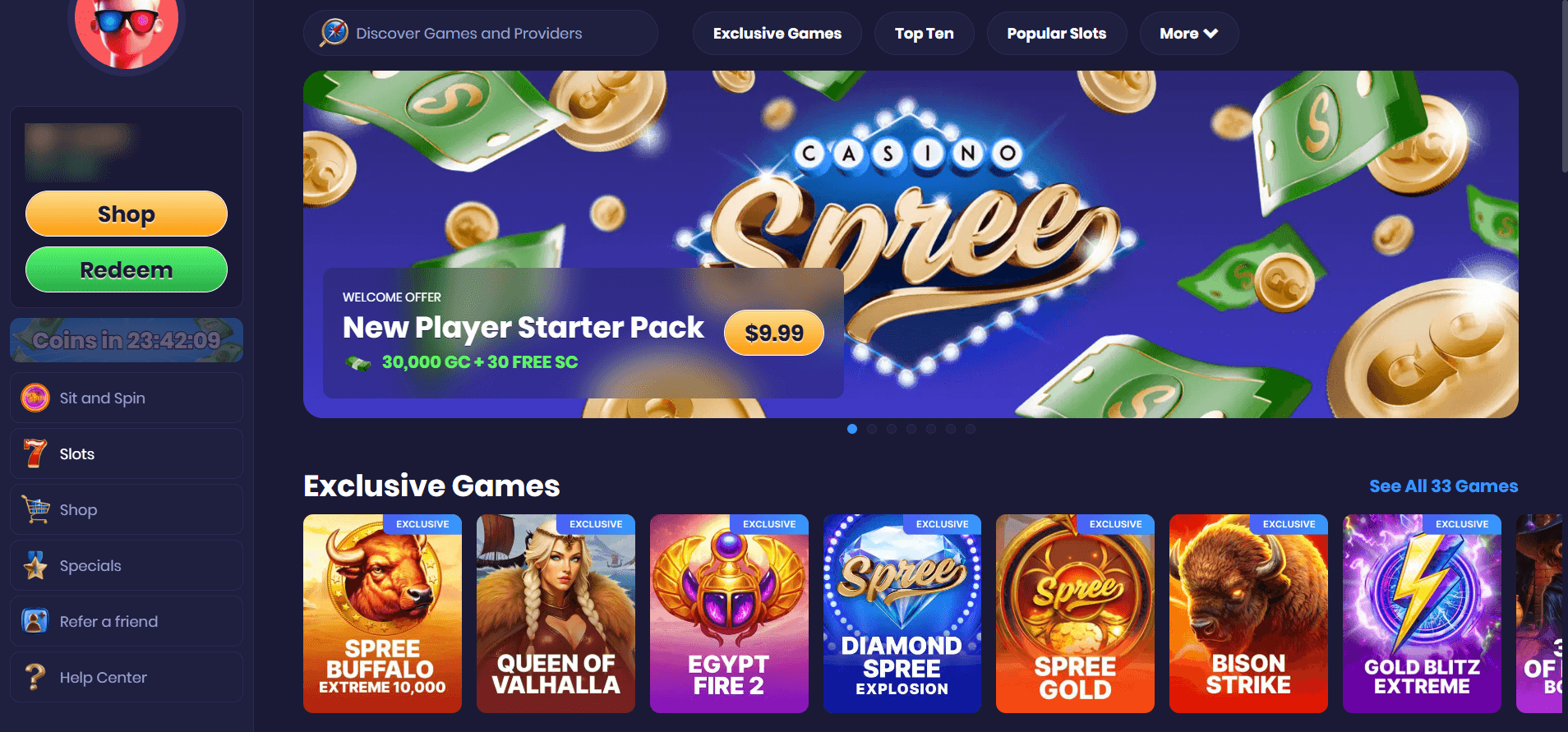 Newcomers can also double dip with a first purchase deal of 30,000 Gold Coins plus 30 Spree Coins for a measly $9.99. The âno deposit bonusâ isnât just hype or a useless buzzword at Spree, itâs reality here. On top of that, Spree rewards players with a host of other pulsating bonuses, here's a rundown of all of them: