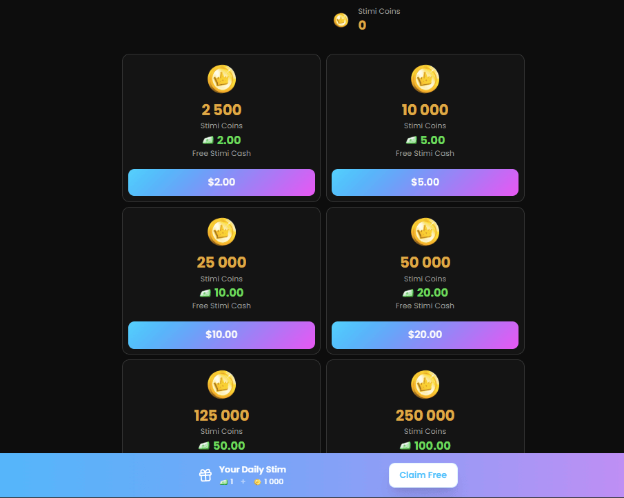 The Shop lets you buy Stimi Coins in bundled packages that each award a matching amount of Stimi Cash, scaling from micro-stakes all the way up to a $250 âhigh-rollerâ bundle. Pricing is linear: small packages give a few thousand Coins and a handful of Stimi Cash, while the $250 bundle buys you 1,000,000 Stimi Coins and 250 Stimi Cash, which is the maximum weekly redemption limit anyway.