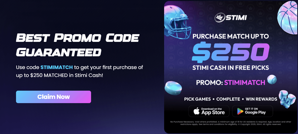 | STIMI50 (First Purchase) | $50 in Free Picks for a $20 Stimi Coins purchase. | Use Free Picks on eligible markets; winnings are redeemable without extra playthrough. | Free Picks must be claimed and used within seven days of signup. | Applies to supported sports picks; standard props and lines qualify, but niche markets may be excluded at Stimiâs discretion. |