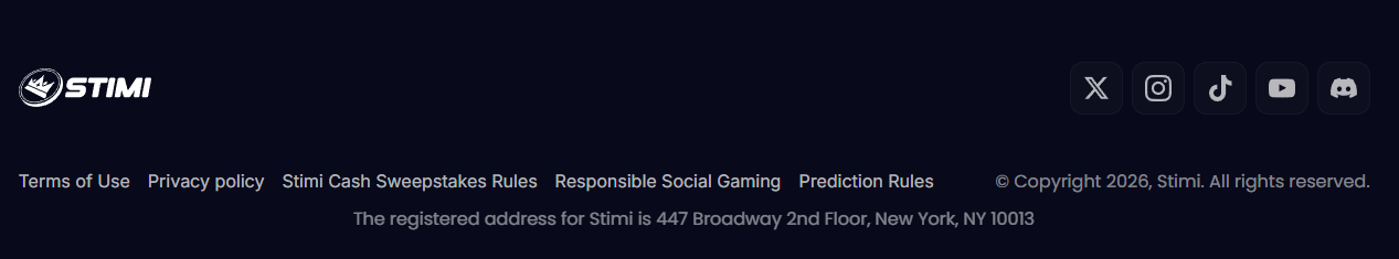 Stimi is operated by PropX Incorporated, listed at 447 Broadway, 2nd Floor, New York, NY 10013, and runs as a social sportsbook using a dual-currency sweepstakes model rather than as a traditional real-money sportsbook.Â