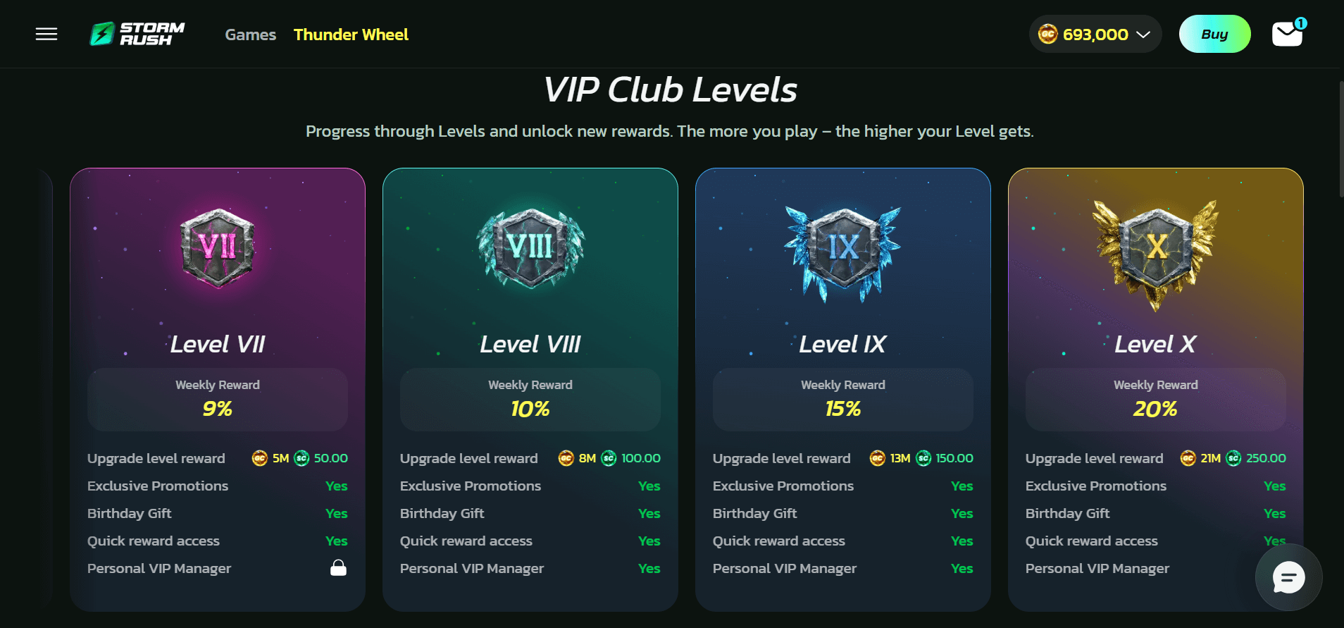 The VIP system at Stormrush follows the standard tier progression model, rewarding players according to consistency and playing habits. I was thrilled to see that Stormrush had spent time on creating tantalizing visuals for each tier that fit with the theme of the platform. Ultimately, I think the VIP system did its job it kept me hooked on the exciting gameplay loop and had me chasing that coveted next level. Here's a comprehensive breakdown of the Stormrush VIP system: