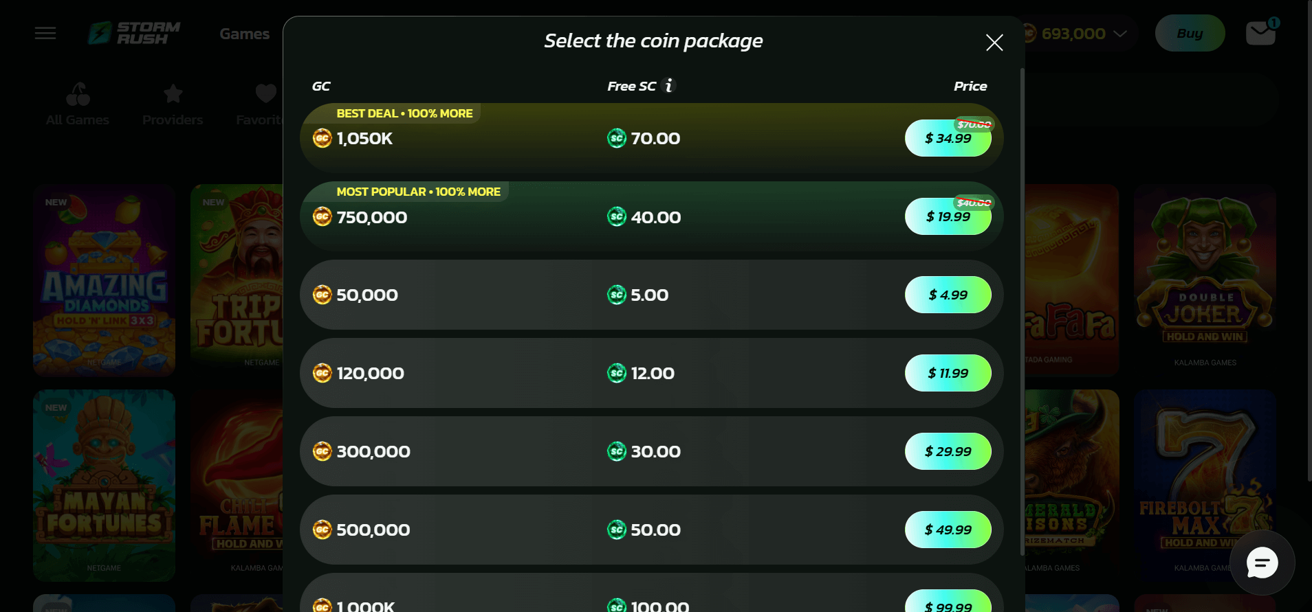 - Mid-tier and promo packages: $19.99 for 750,000 + 40 SC
