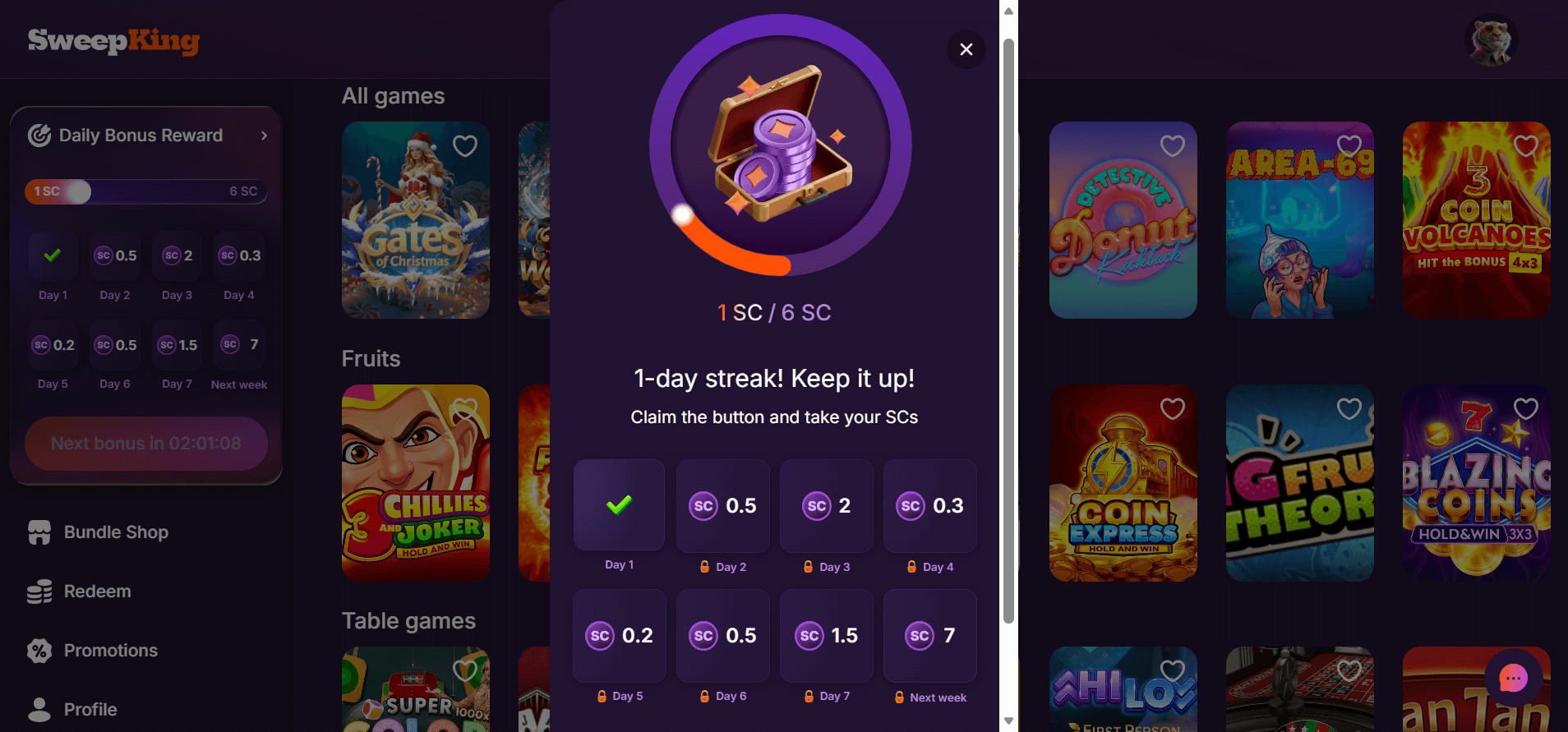 1 SC x6 (6 Sweeps Coins over a week) |