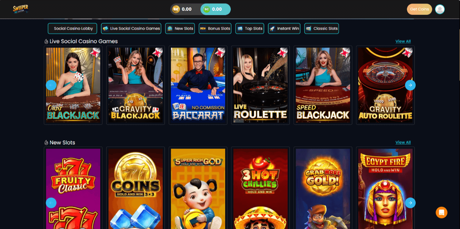There’s variety but not scale. Sweeper runs about 100 games — mostly slots, but also five table games, a handful of instant-win titles, and live dealer options from vendors like Hacksaw Gaming, Backseat Gaming, and ICONIC21. If you want a massive slot catalog, Crown Coins Casino or LoneStar Casino pack hundreds more.