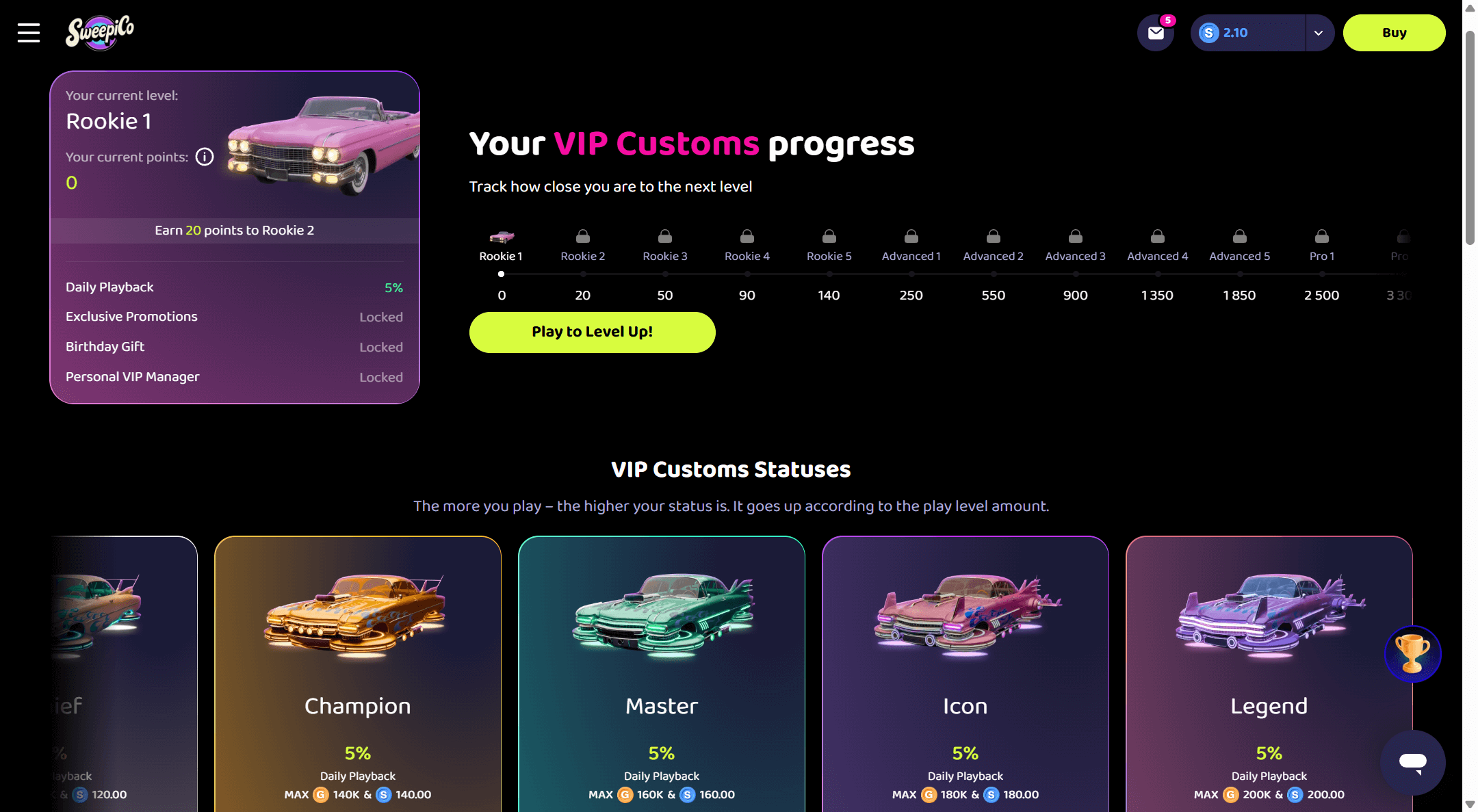 The SweepiCo VIP program is surprisingly ambitious, with ten broader tiers broken down into five levels each, creating a long runway of progression for frequent slot players. As I played more slots free games and regular Sweeps spins, the steady trickle of VIP points did make me feel like my volume mattered, but the sheer number of levels can be overwhelming if you are more casual.