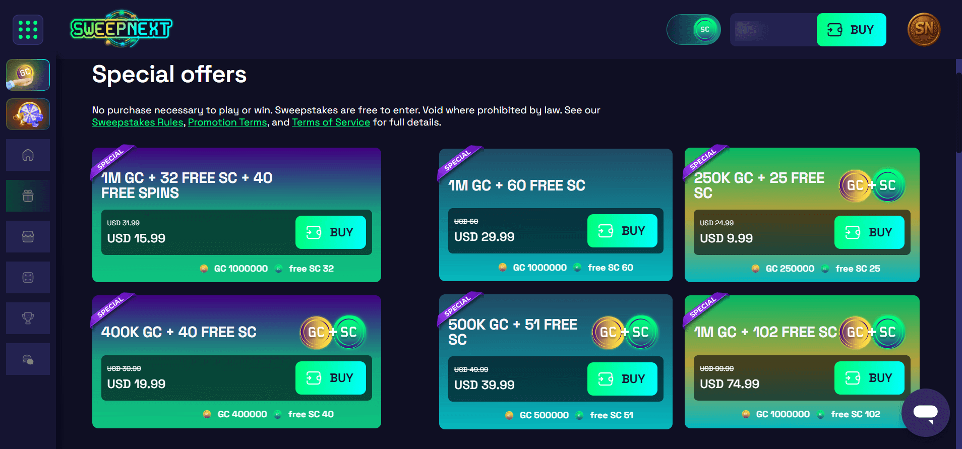 - Sweeps Coins (SC): Redeemable 1:1 for USD prizes