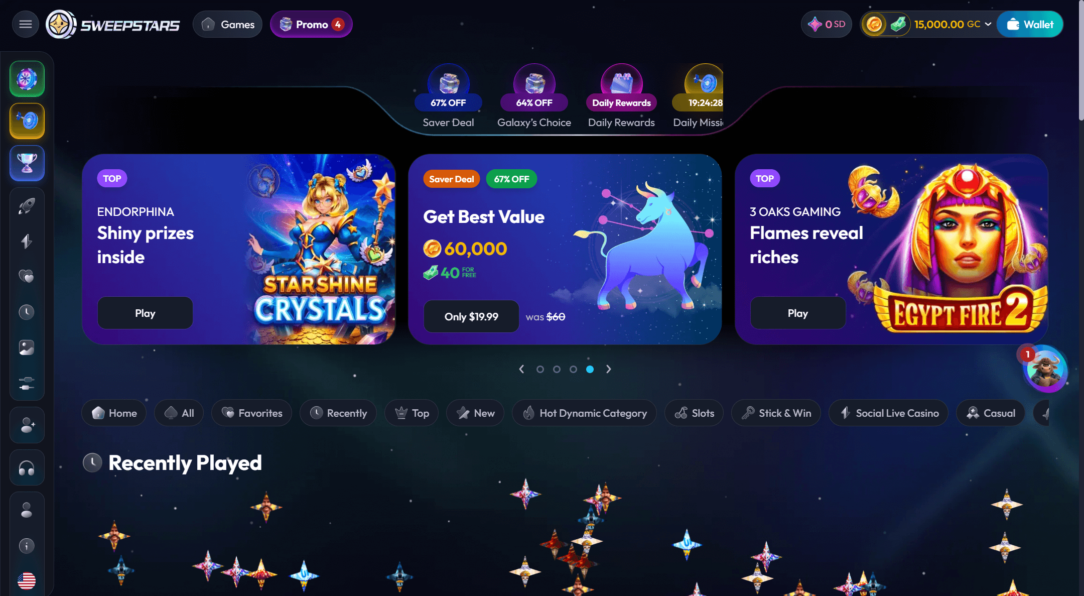 | StarDust Hub | Third currency accumulated through gameplay and promotions | Exchange 10 StarDust for around 0.5 SC, SC free spins, or Wheel of Fate spins with prizes | Earned over time by active play with Gold Coins and SC |