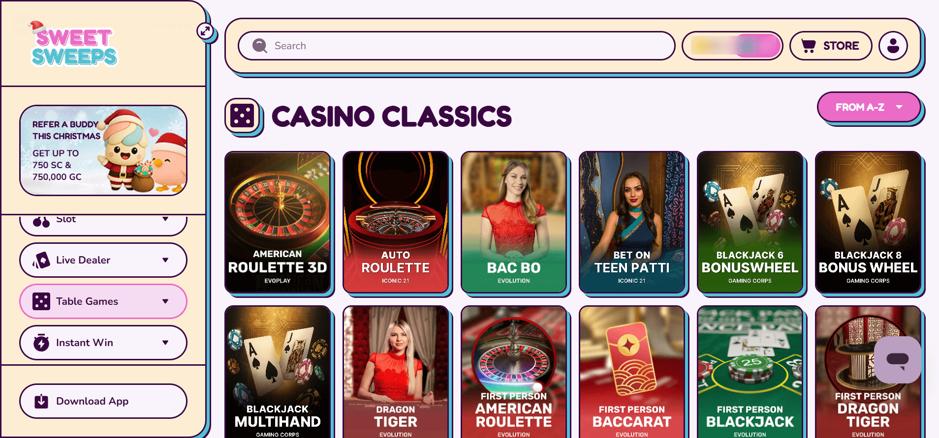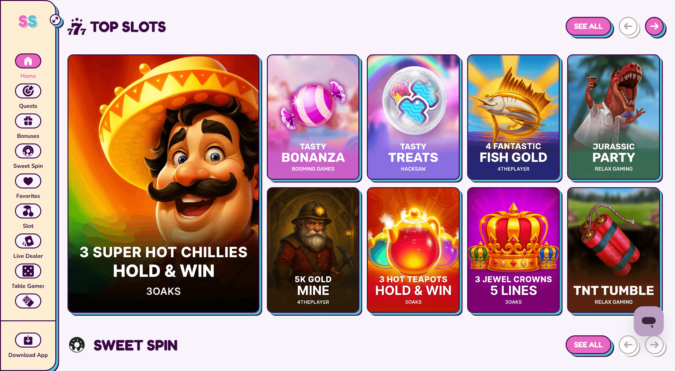 Sweet Sweeps has an expansive casino game library including slots, table games, live dealer options, crash games, plinko, mines and even a few originals.