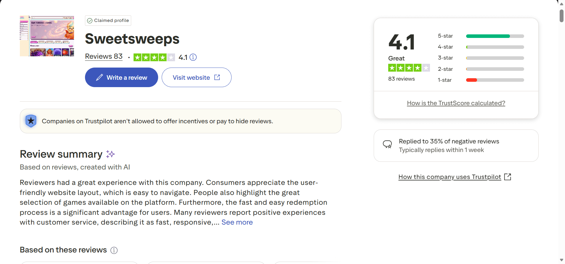 Sweet Sweeps maintains a positive reputation across review platforms, with a 4.1-star rating on Trustpilot showcasing numerous satisfied players praising customer support and redemption experiences. The casino launched in July 2025, so long-term player testimonials remain limited, but early feedback demonstrates promising service quality. Here's just a snapshot of what real sweepstakes players are saying about Sweet Sweeps: