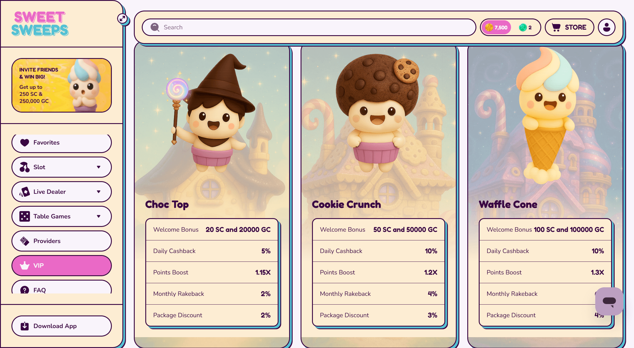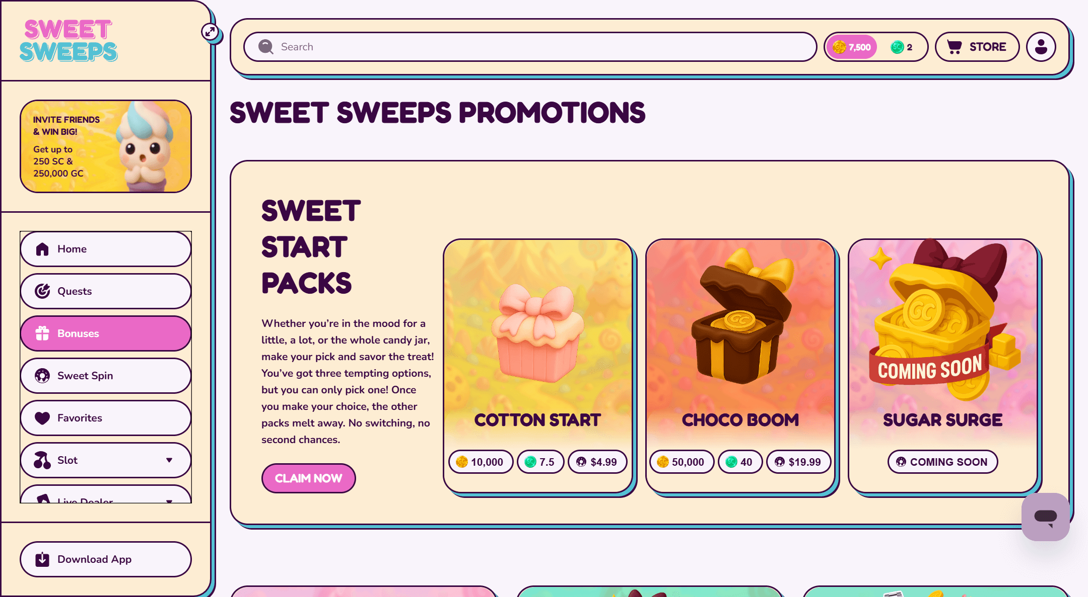 I grabbed 7,500 GC + 2.5 SC no deposit after registration, then got tempted by first-purchase packs ($4.99 for 10 SC + 10,000 GC, $19.99 for 40 SC + 50,000 GC). Daily SC cashback, a unique Sweet Spin wheel, a real perks-heavy VIP program, and frequent social promos keep the lollipop spinning. Most ongoing bonuses are still limited, but with social giveaways and âsweet surprisesâ being teased, things look set to ramp up soon. More persistent promo hounds could also try our bonus watch for extra deals.