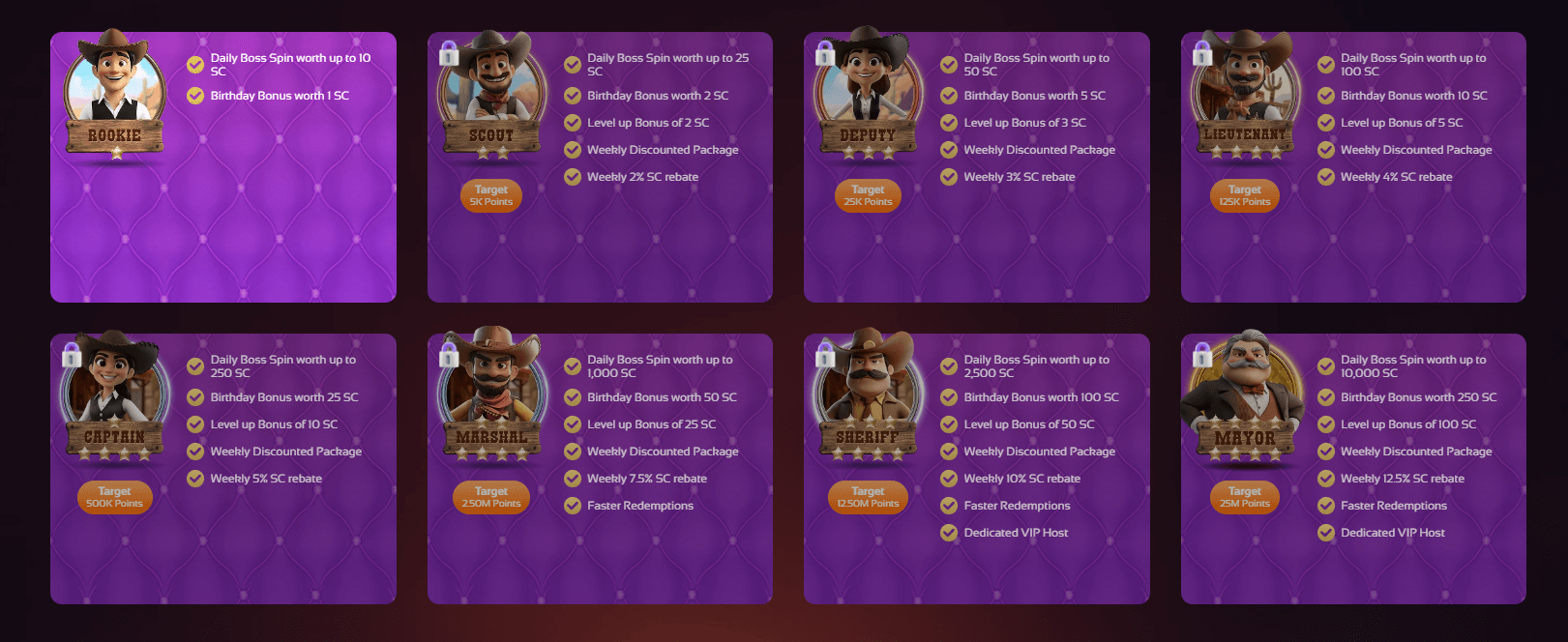 Boss Casino’s standout feature is its polished and personality-driven VIP ladder. Unlike many sweepstakes casinos that use simple metal-tier naming, this platform leans fully into a western sheriff theme. Each rank includes a “Target Points” requirement along with daily boss spins, birthday bonuses, weekly rebates, discounted packages, and in higher tiers — faster redemptions and a dedicated VIP host.