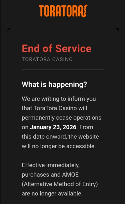 - An official “End of Service” notice informed players that ToraTora Casino would permanently cease operations on January 23, 2026, and that from that date onward the website would no longer be accessible.