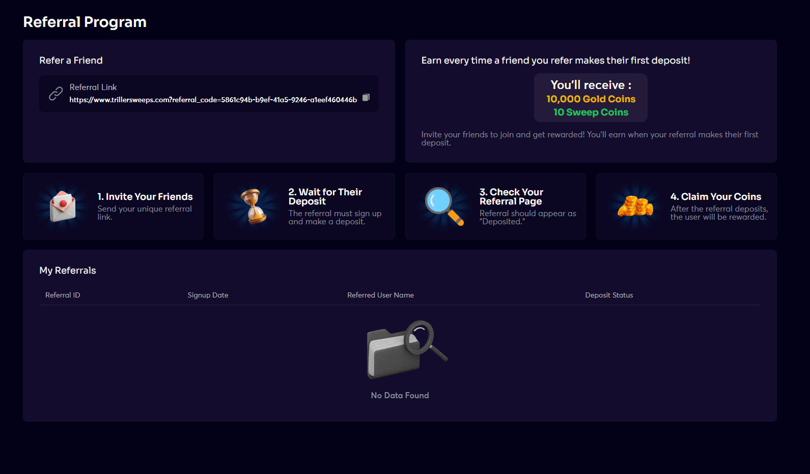 I did not see a clearly labeled VIP tier ladder (Bronze, Silver, Gold, etc.) during my time exploring Triller Sweeps. The site focuses on bonuses, the wheel, referrals, promotions, and redemption rather than a traditional VIP dashboard.