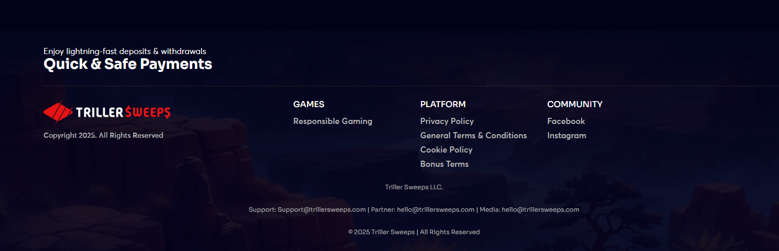 From a pure browsing perspective, Triller Sweeps is smooth. The UI is clean, the game thumbnails are big enough to recognize, and the category organization makes it easy to jump between slots, online blackjack, and poker without hunting.
