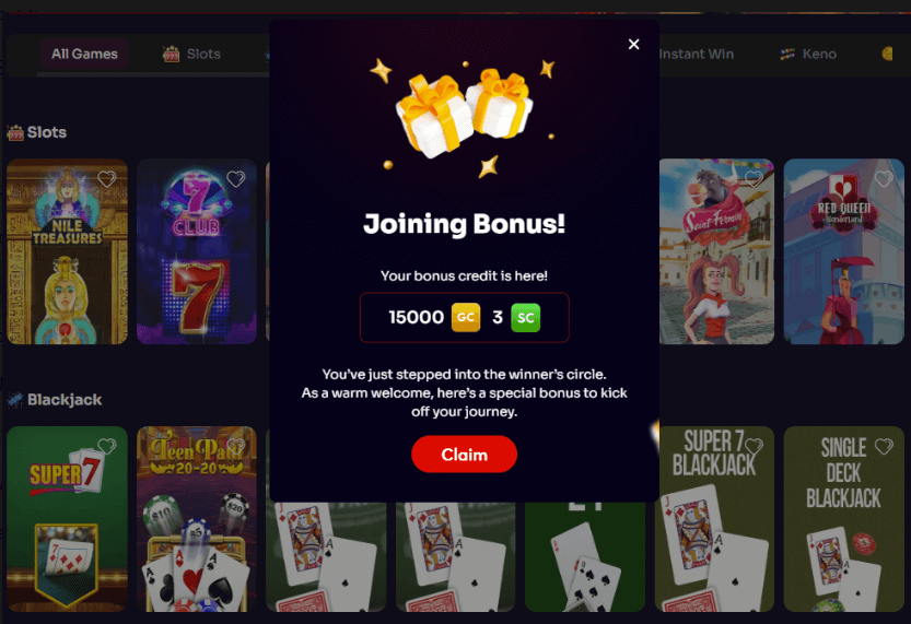 | Joining Bonus (shown): 15,000 GC + 3 SC | No playing requirements, instant on sign-up | Not publicly stated. | Applies across the lobby categories. | SC is typically the prize-eligible currency; exact redemption rules are listed in site terms. |
