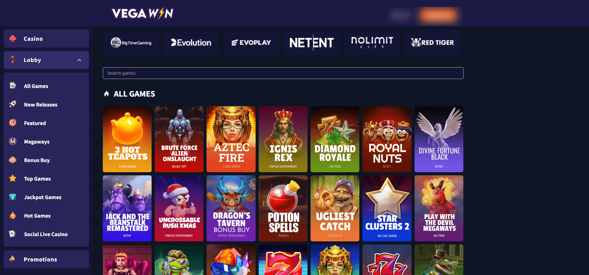 Minimum bet limits skew higher than industry average, with 100 GC to 1,000 GC (occasionally 10,000 GC) requirements that can deplete free-play balances quickly. This positions VegaWin toward players willing to purchase coin packages rather than exclusively free-play users. Filtering options include software providers, game genres, Megaways, Bonus Buy, Jackpot Games, and Hot Games, with a functional search box that actually prioritizes relevant results.