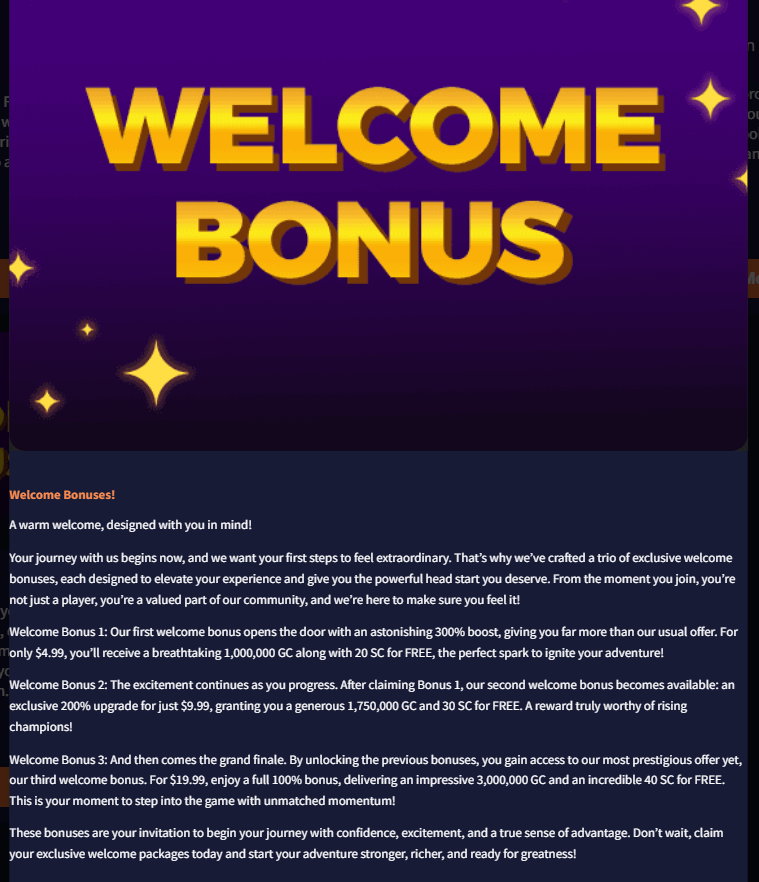 Where VegaWin distinguishes itself is the triple-tier first purchase structure. Your initial $4.99 purchase nets 1,000,000 GC + 20 SC with a 300% bonus, the second deal at $9.99 provides 1,750,000 GC + 30 SC (200% boost), and the third purchase for $19.99 awards 3,000,000 GC + 40 SC (100% bonus). This progressive system encourages incremental commitment rather than demanding a large upfront investment, something I appreciated during my testing period.