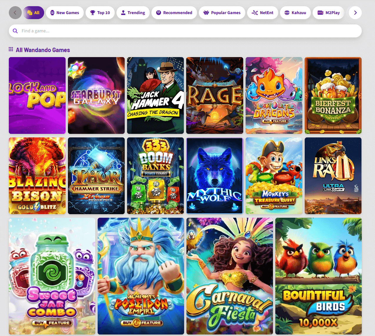 Wandando’s strongest point is that it actually has a recognizable slots lobby. The games page is laid out with filters like New Games, Top 10, Trending, Recommended, and Popular, plus provider tags. I saw provider labels including NetEnt, and the thumbnails include mainstream-looking titles and art styles that feel similar to what you see in bigger platforms.