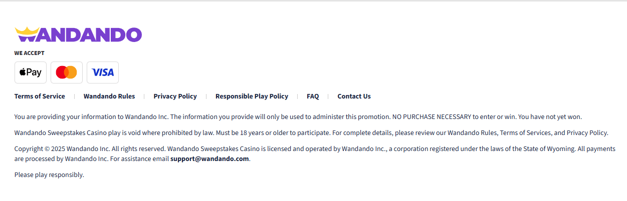 The footer shows that Wandando accepts Apple Pay, Mastercard, and Visa. That is the cleanest part of the financial picture. What is less clear is the full list of redemption methods and typical payout timing by method. If you are looking for the fastest paying sweepstakes casinos, Wandando does not currently earn that label based on what it discloses publicly.