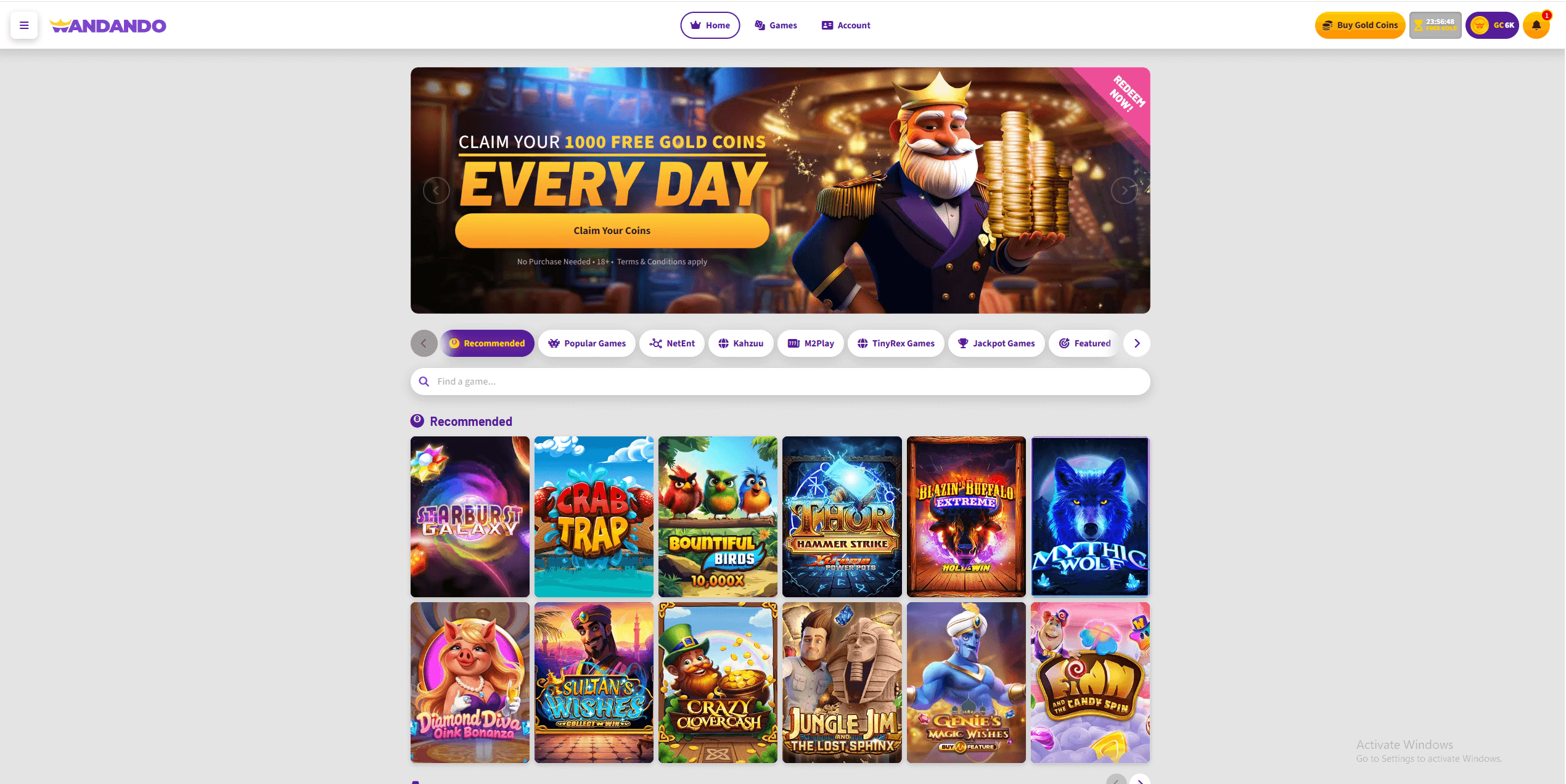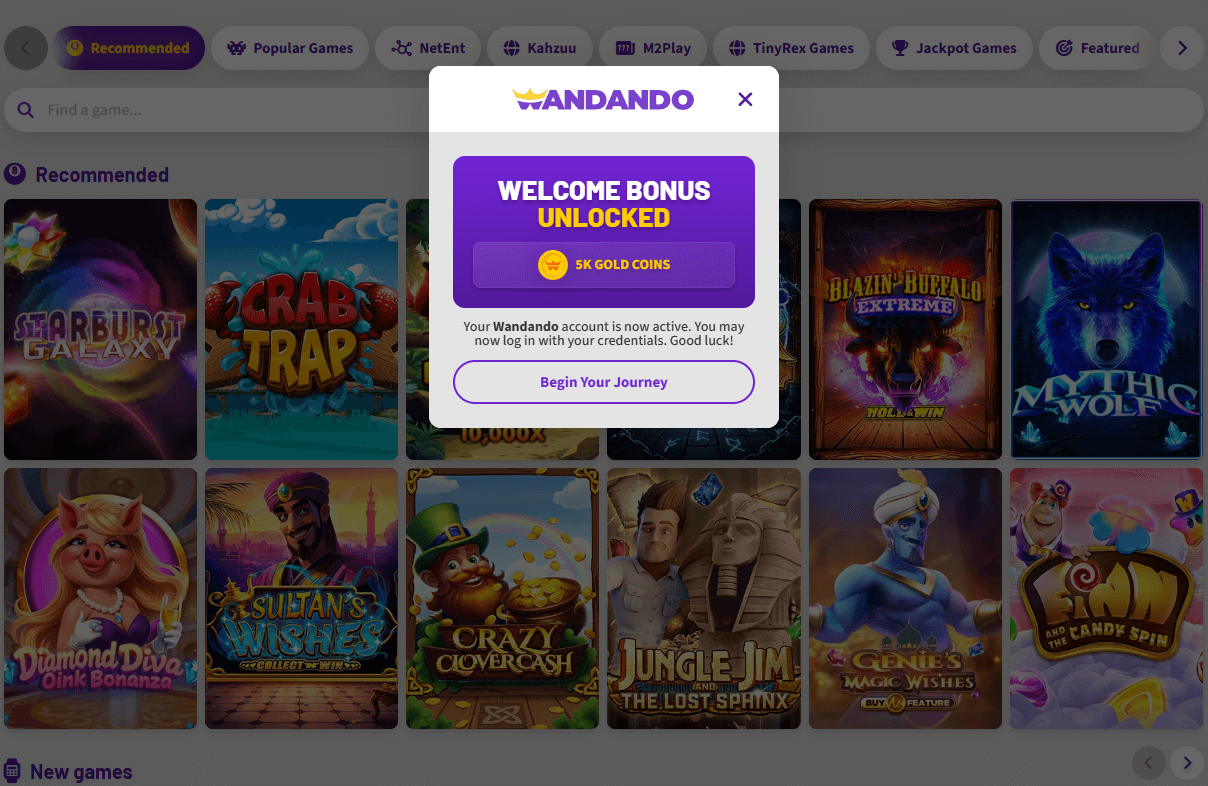 I will start with the sign-up bonus, because it sets expectations fast. Wandando credited my account with 5,000 Gold Coins and that was it. No Sweeps Coins at registration. For a platform that advertises sweepstakes play, that is a very bad first impression. In practical terms, you can do some free slots play with Gold Coins, but you are not actually testing the sweepstakes side until you collect Sweeps Coins later.