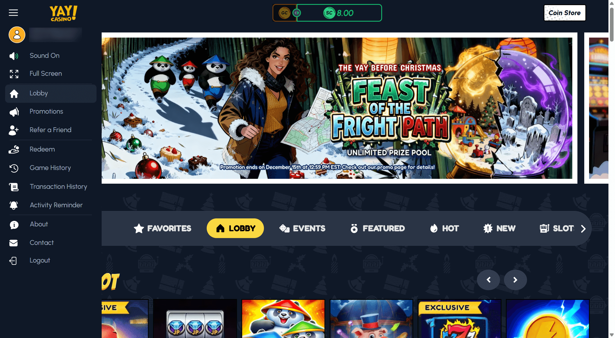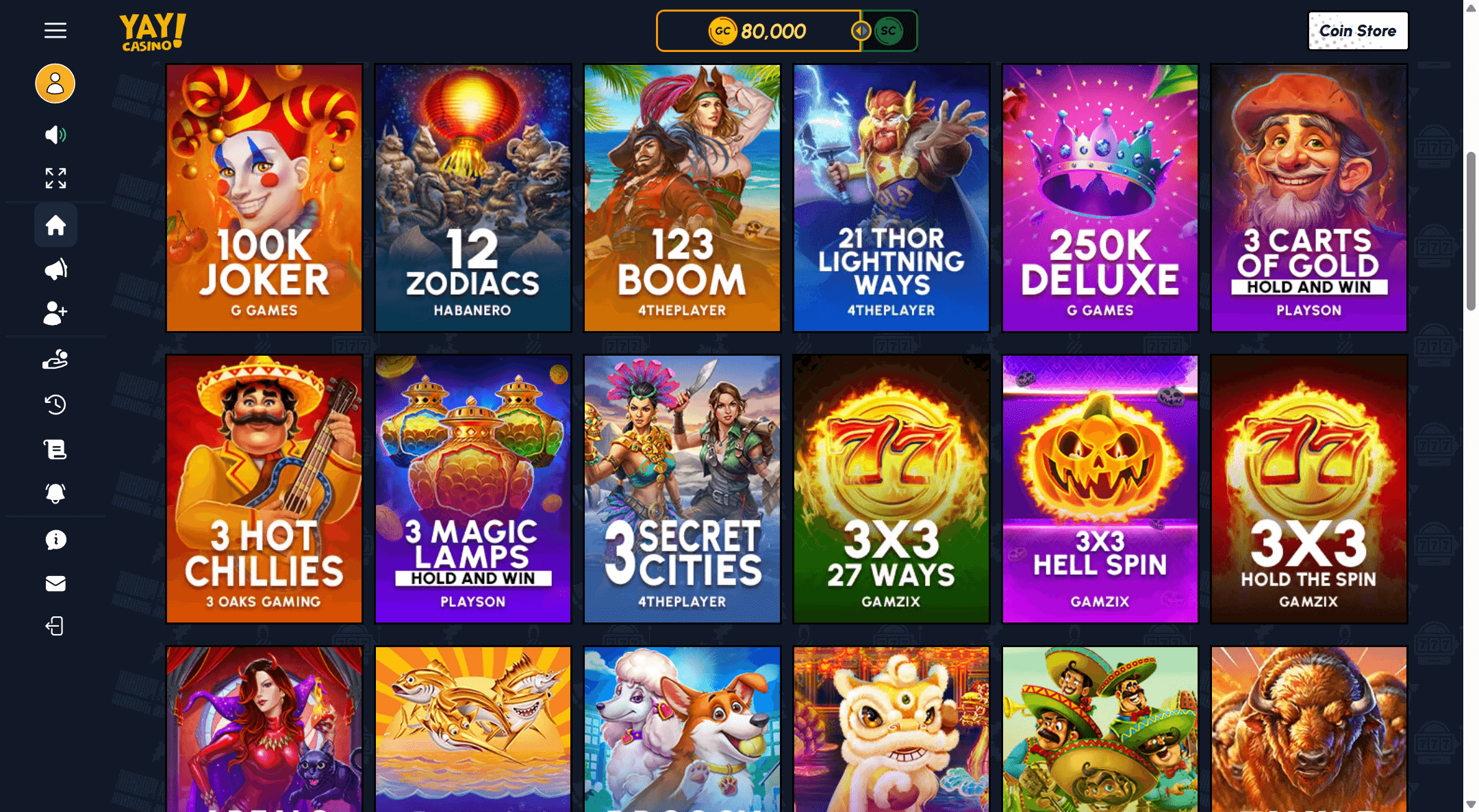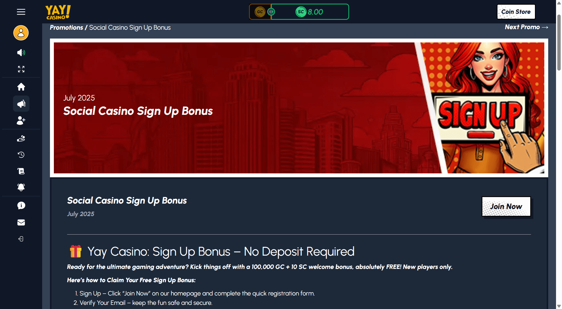 When I created my Yay account, the welcome bundle of Gold Coins and Sweeps Coins set the tone immediately, with a prominent offer around 50,000 Gold Coins plus 5 Sweeps Coins available simply for registering and verifying my details rather than grinding through long forms. You can aim up to 100,000 GC + 10 SC no deposit welcome bonus. That is a strong starting point in the current social casino landscape and, while it is not the absolute biggest number on the market, it let me test a wide range of games in one sitting without feeling like I was risking anything important. If you mainly chase headline grabbing bonuses, you might still find more aggressive promos at sites like Splash Coins, but the structure at Yay is at least transparent and easy to understand.