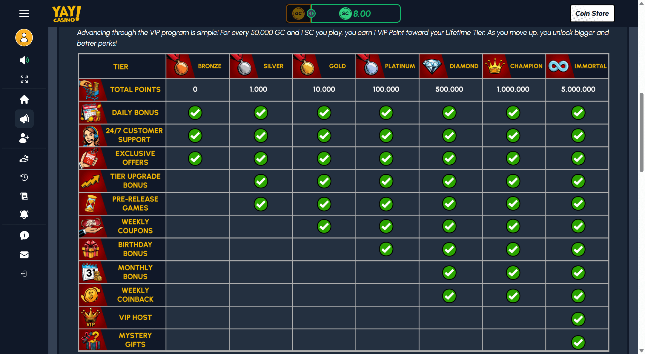 The Yay Casino VIP program uses a lifetime points system where you climb from Bronze through Silver, Gold, Platinum, Diamond, Champion, and finally Immortal by wagering Gold Coins and Sweeps Coins. Each new tier unlocks more perks, starting with basics like daily bonuses and 24/7 support at Bronze, then adding exclusive offers, tier upgrade bonuses, pre-release games, weekly coupons, birthday and monthly bonuses, weekly coinback, a dedicated VIP host, and mystery gifts at the very top. It is designed so that casual players get steady value while high volume players are rewarded with increasingly personalised and frequent rewards.