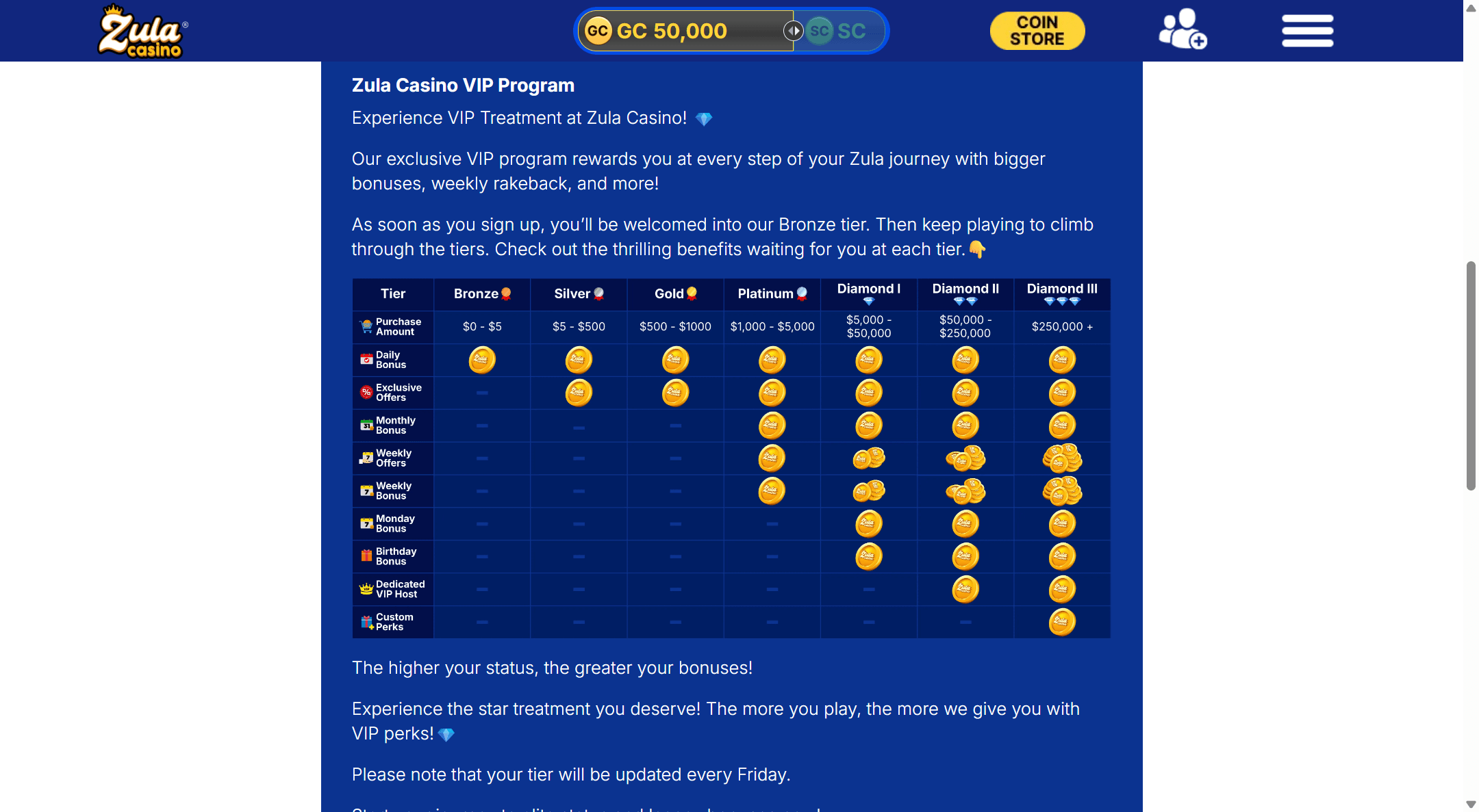 | Tier | Lifetime Purchase Amount | Daily Bonus | Exclusive Offers | Monthly Bonus | Weekly Offers | Weekly Bonus | Monday Bonus | Birthday Bonus | Dedicated VIP Host | Custom Perks |