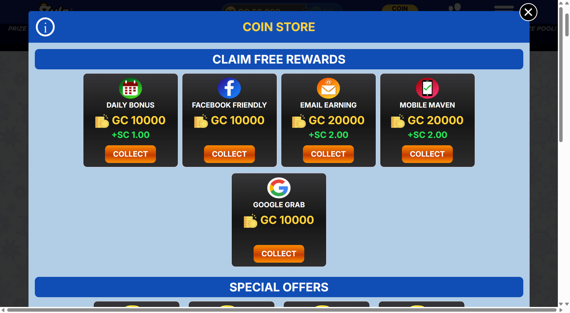 | Daily Login Bonus and Ongoing Free Coins Promotions | Typically no wagering requirement on GC, any SC granted through promos usually carry 1x requirement. | Daily login resets every 24 hours, time limited raffles and events display countdown timers in the lobby. | Login rewards mostly credit GC, with occasional SC boosts tied to events, usable on most games excluding any that are specifically excluded in promo rules. | Only SC from eligible modes count toward redemption, with prizes subject to Zula’s verification and regional availability. |